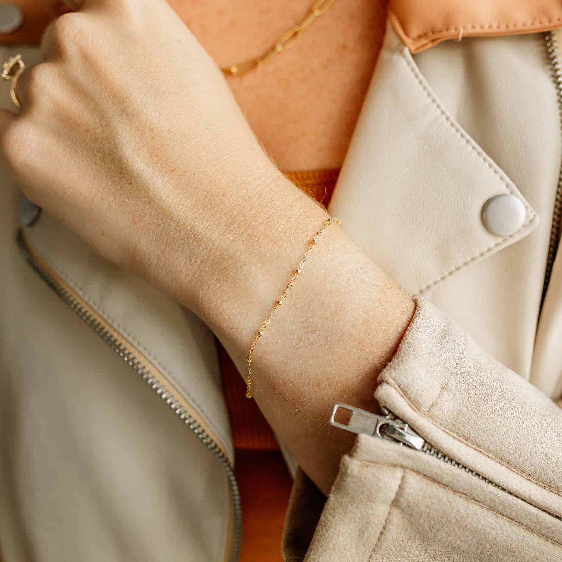 A delicate beaded 14k gold filled or sterling silver satellite chain bracelet, looks great layered or alone. Details: * 14k gold filled or sterling silver * hypoallergenic. 14k gold filled is anti-tarnish. A portion of the profit from the sale of this jewelry is donated to charities that fight human trafficking.