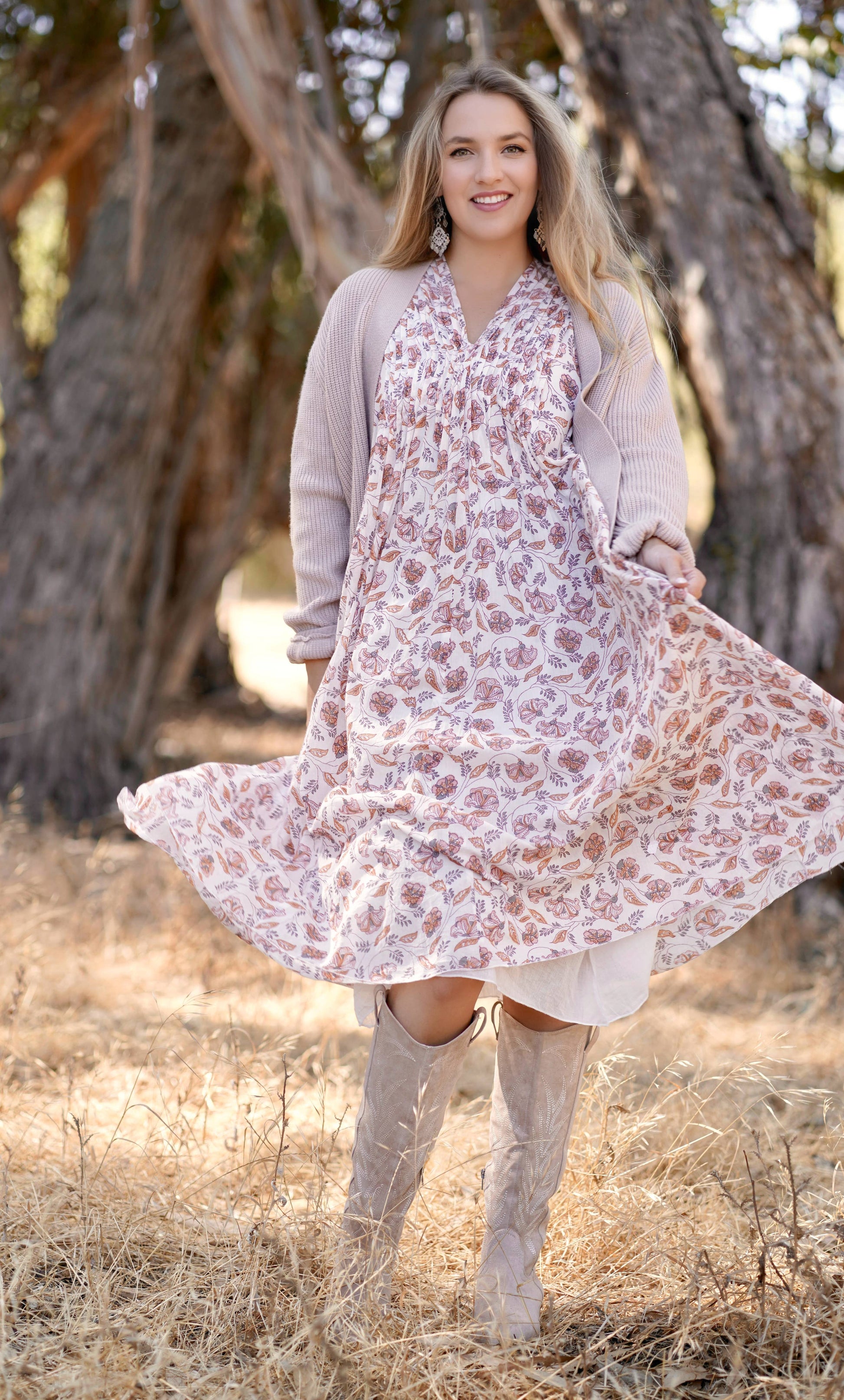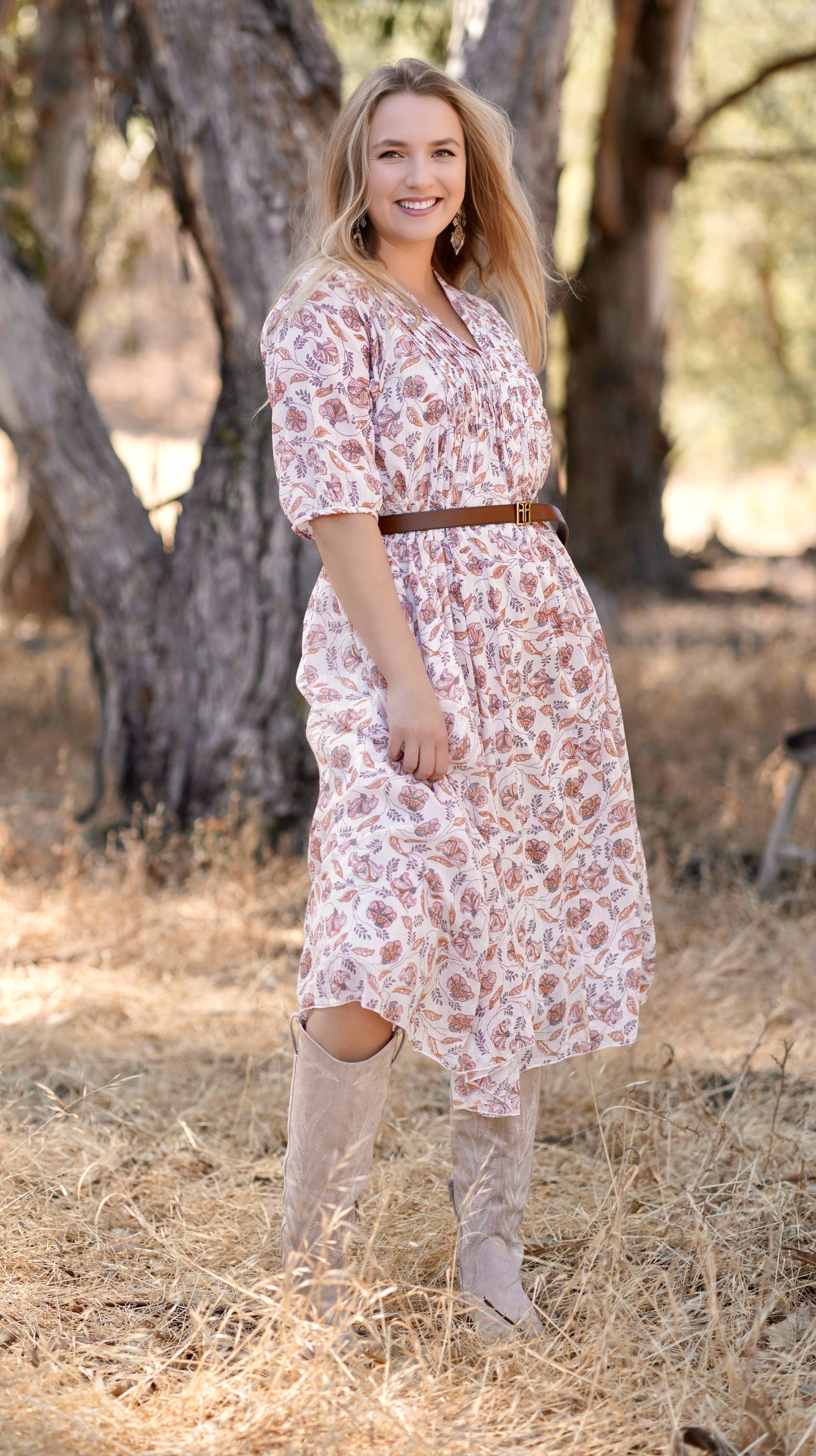 A great dress for all seasons. Versatile. Lightweight. 100% cotton. Lined inside. 3/4 Elbow Length Sleeves. A-line silhouette with pin-tucking at the neckline. Bonus: she’s got pockets. Care: Machine Wash, Gentle Cycle. Hang to Dry. Sustainably made in India.