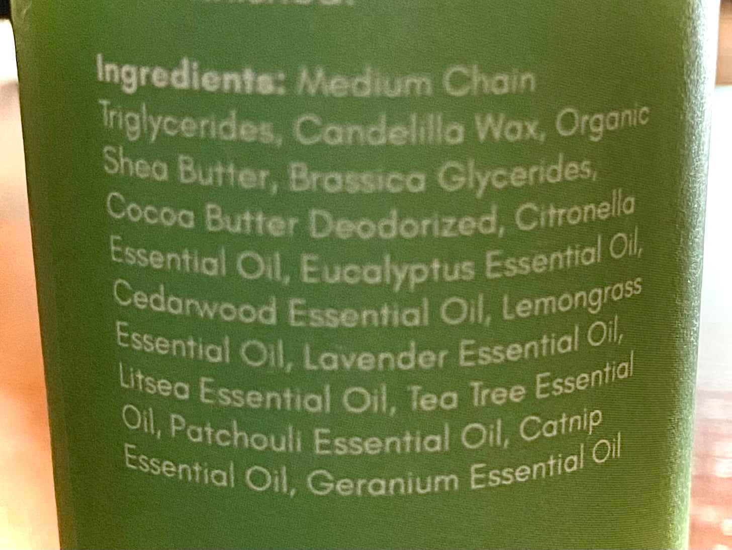 Medium Chain Triglycerides, Candelilla Wax, Organic Shea Butter, Brassica Glycerides, Cocoa Butter Deodorized, Citronella Essential Oil, Eucalyptus globulus Essential Oil, Cedarwood Essential Oil, Lemongrass Essential Oil, Lavender Essential Oil, Litsea Essential Oil, Tea Tree Essential Oil, Patchouli Essential