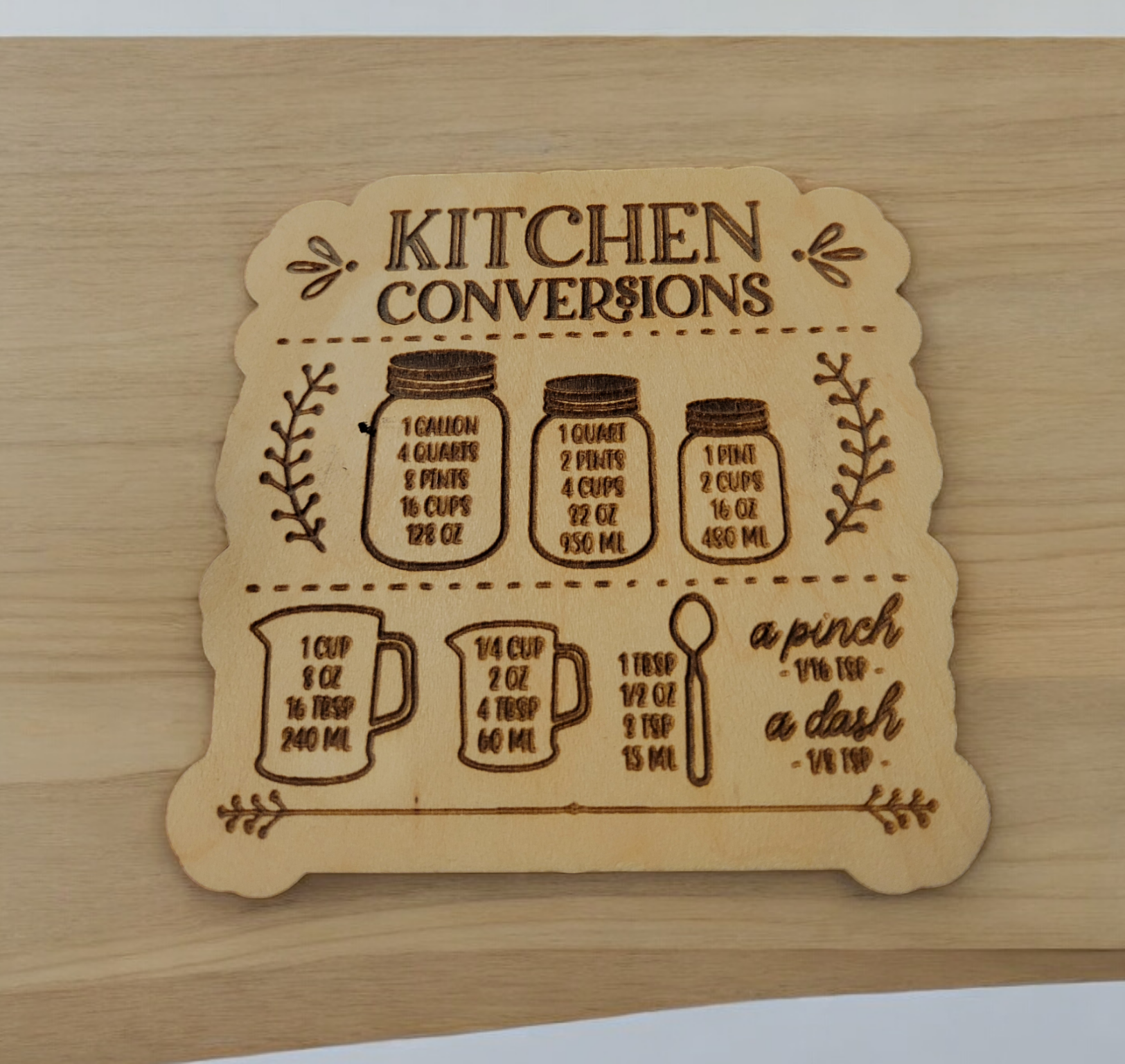 This wooden Kitchen Conversion Measurement Magnet is a reaaally helpful handy reference. Approx 4" across. Handmade from quality maple wood by a small woman-owned business in Wisconsin.