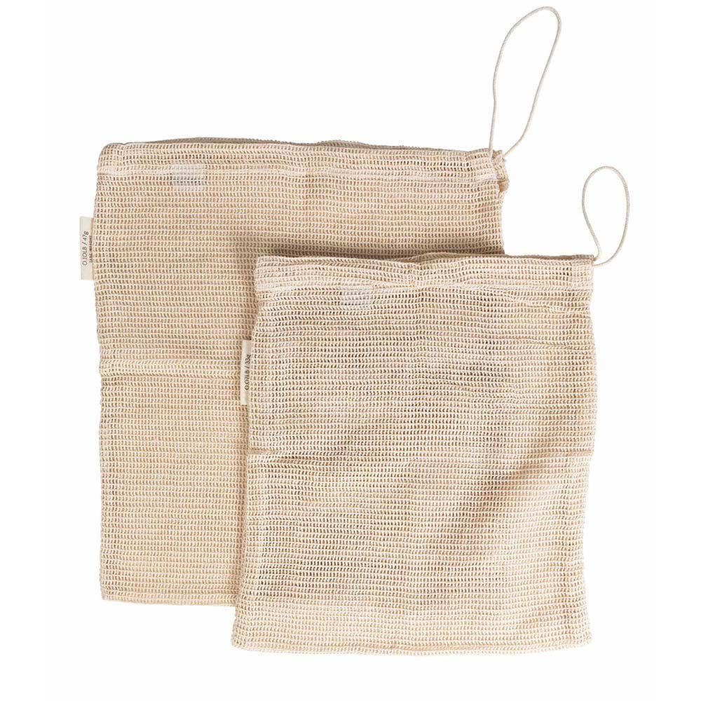 Durable, sturdy organic cotton mesh - Smaller bag: 12.5 x 10.25 inches when flat, Larger bag: 15 x 13 inches when flat - Set of two; drawstring closure.