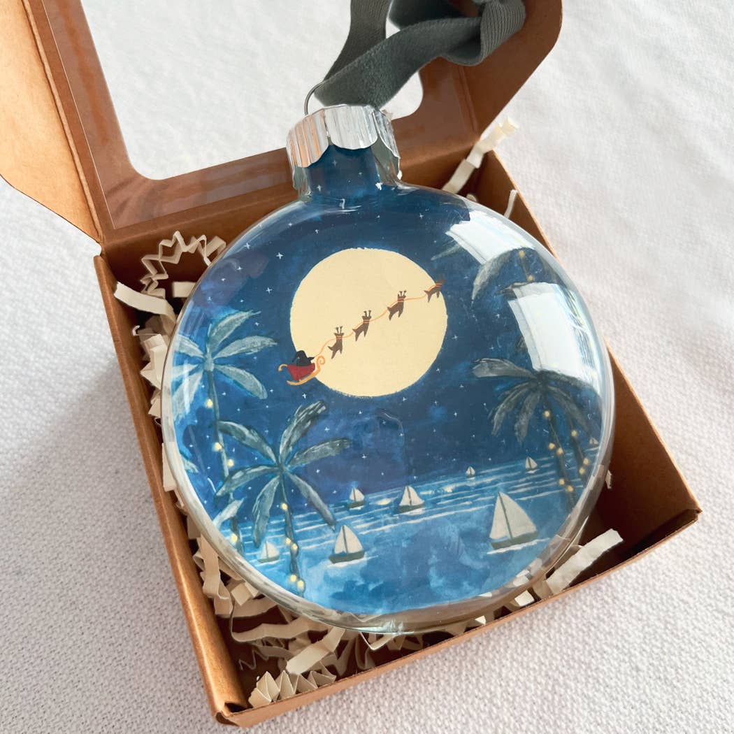 A fave this year. This Santa at Midnight ornament is some of the coolest holiday artwork we’ve seen in a while. Santa sleigh riding by a full moon over a tropical bay. Each ornament is individually packaged in a kraft box with a clear window on top. Please note that due to the glass nature of the ornament, each has its own unique shape and details which may include little bubbles in the glass. Please also note that the ribbon color and material may vary from what is pictured. Material: Glass. Size: 3 x 3 inches. Original artwork by Salty Kai. Made in Florida.