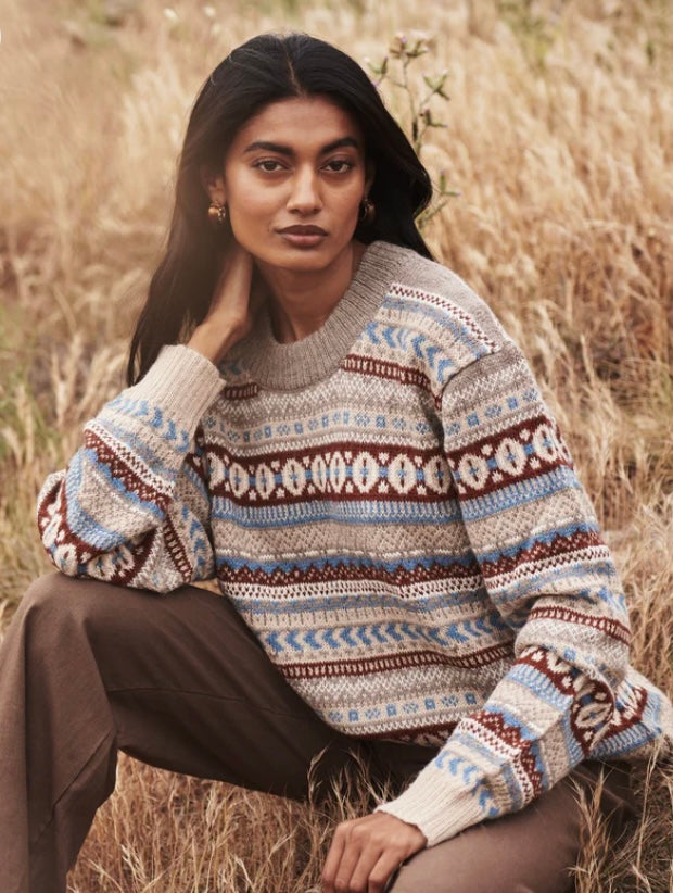 This soft gorgeous sweater has a classic Scandinavian-style design with a large loose crewneck rim. Warm tones, perfect for fall/winter. 100% alpaca. Made in Peru. Care: wash inside out by hand or gentle cycle. Lay flat to dry.