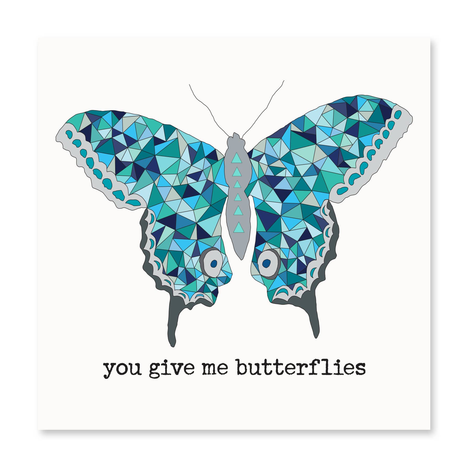 Beautiful butterfly print in blue hues with “you give me butterflies” message. 100% American Made. Printed on FSC Certified recycled card stock -5x5 in size -Blank inside -Envelope included / A portion of all sales is donated to ocean conservation nonprofits like Orca Conservancy, Ocean Alliance, and Sea to Shore.